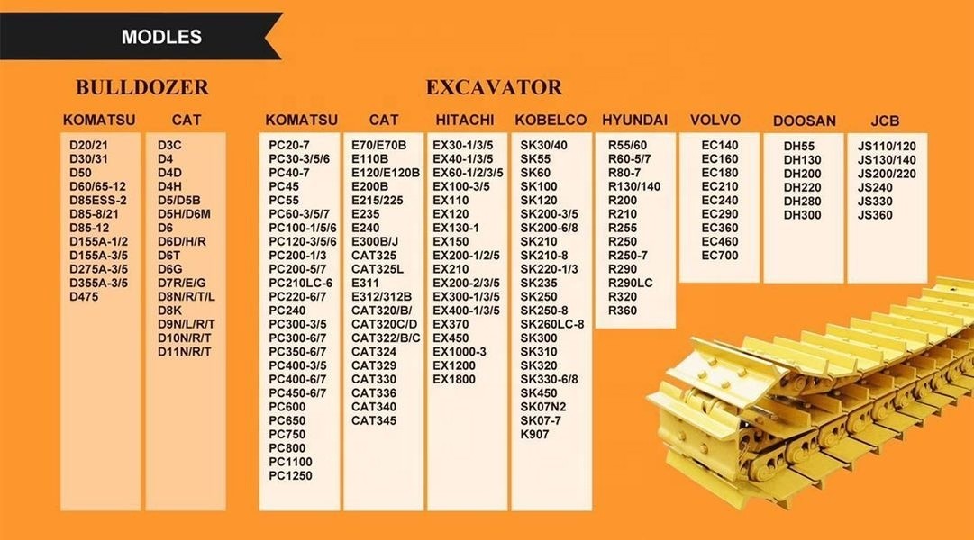 Wir können sowohl Standard-Spurverbindungsanlage als auch versiegelte und geschmierte Spurkette (SALT) für Bagger und Bulldozer mit einer Spurverbindung von 101 mm bis 260 mm liefern.